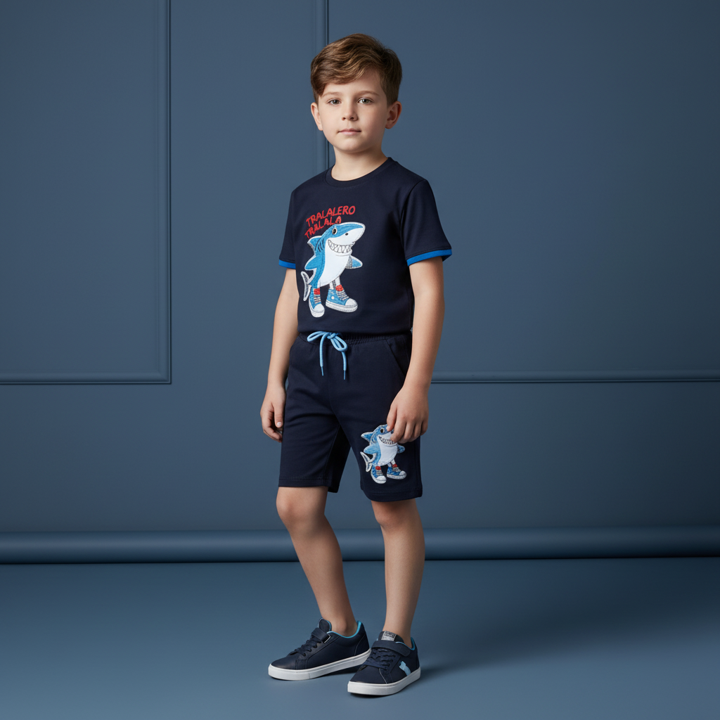 Este conjunto de verano está inspirado en la energía y la alegría de Tralalero Tralalá, con una combinación de azul, celeste y en gris que transmite frescura y aventura. Ideal para los pequeños que aman moverse, explorar y expresarse con personalidad.