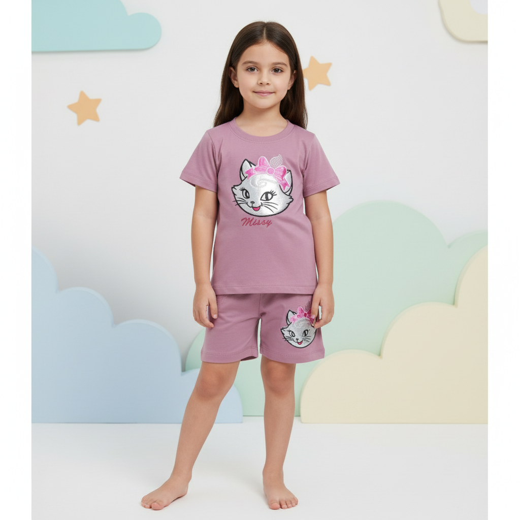 El diseño presenta una estampa de gatita con moño en tonos brillantes, aplicada tanto en la remera como en el short, logrando un conjunto armonioso, tierno y moderno. El color rosa empolvado le da un estilo dulce y fácil de combinar.