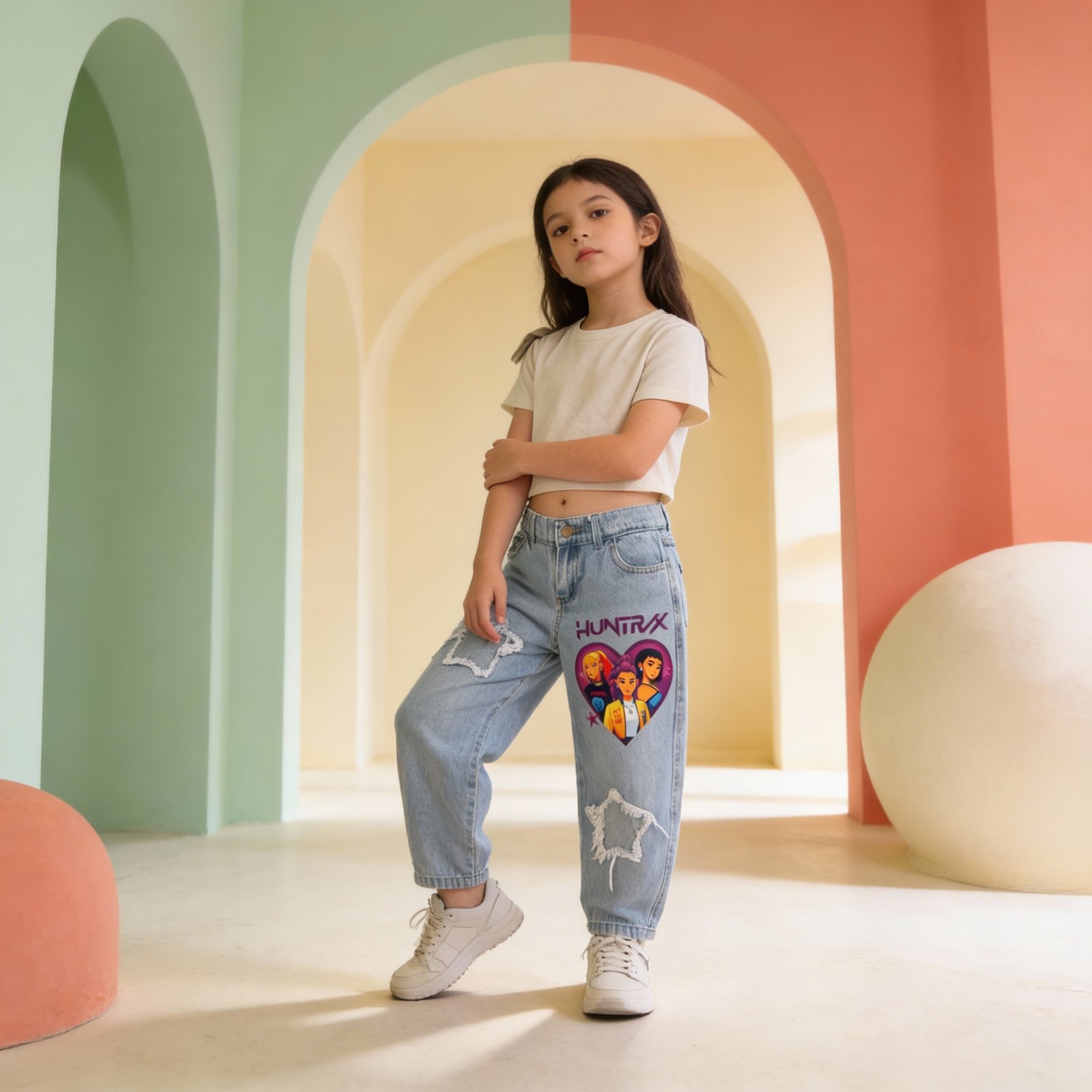 Cuenta con estampa Huntrix aplicada sobre la pierna, que le aporta personalidad y un estilo moderno, y detalles decorativos tipo parche que completan el diseño.