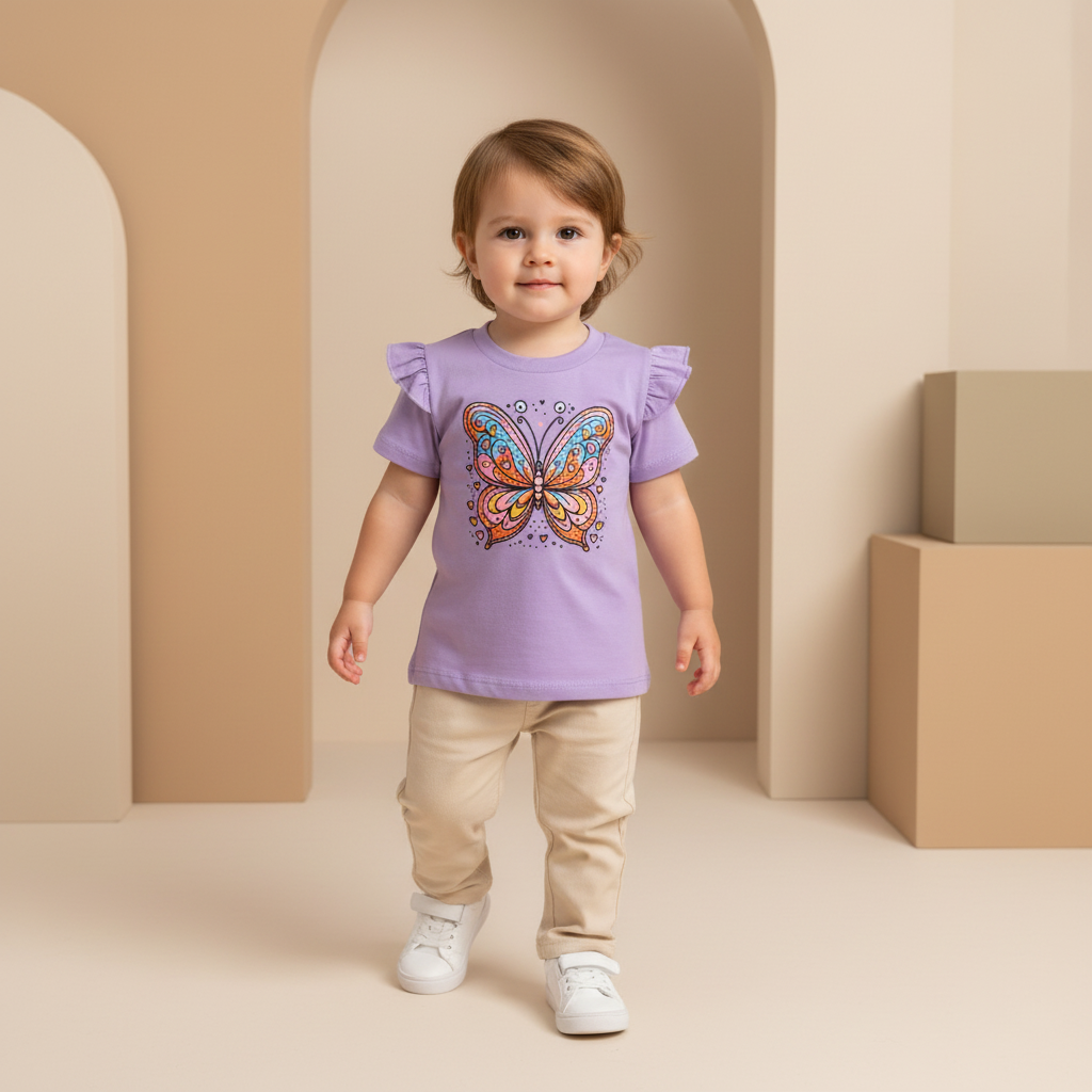 Una prenda fresca, cómoda y llena de ternura. Esta musculosa rosa con voladitos en los hombros y una gran mariposa estampada combina lo mejor del estilo y la diversión para las más peques.